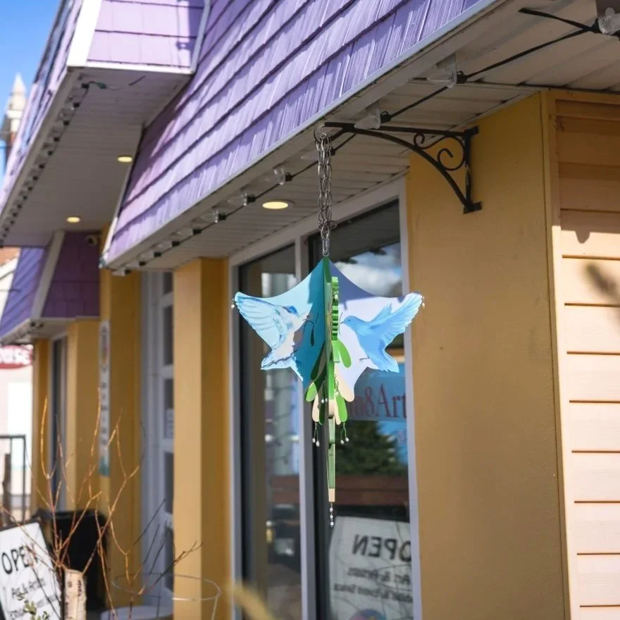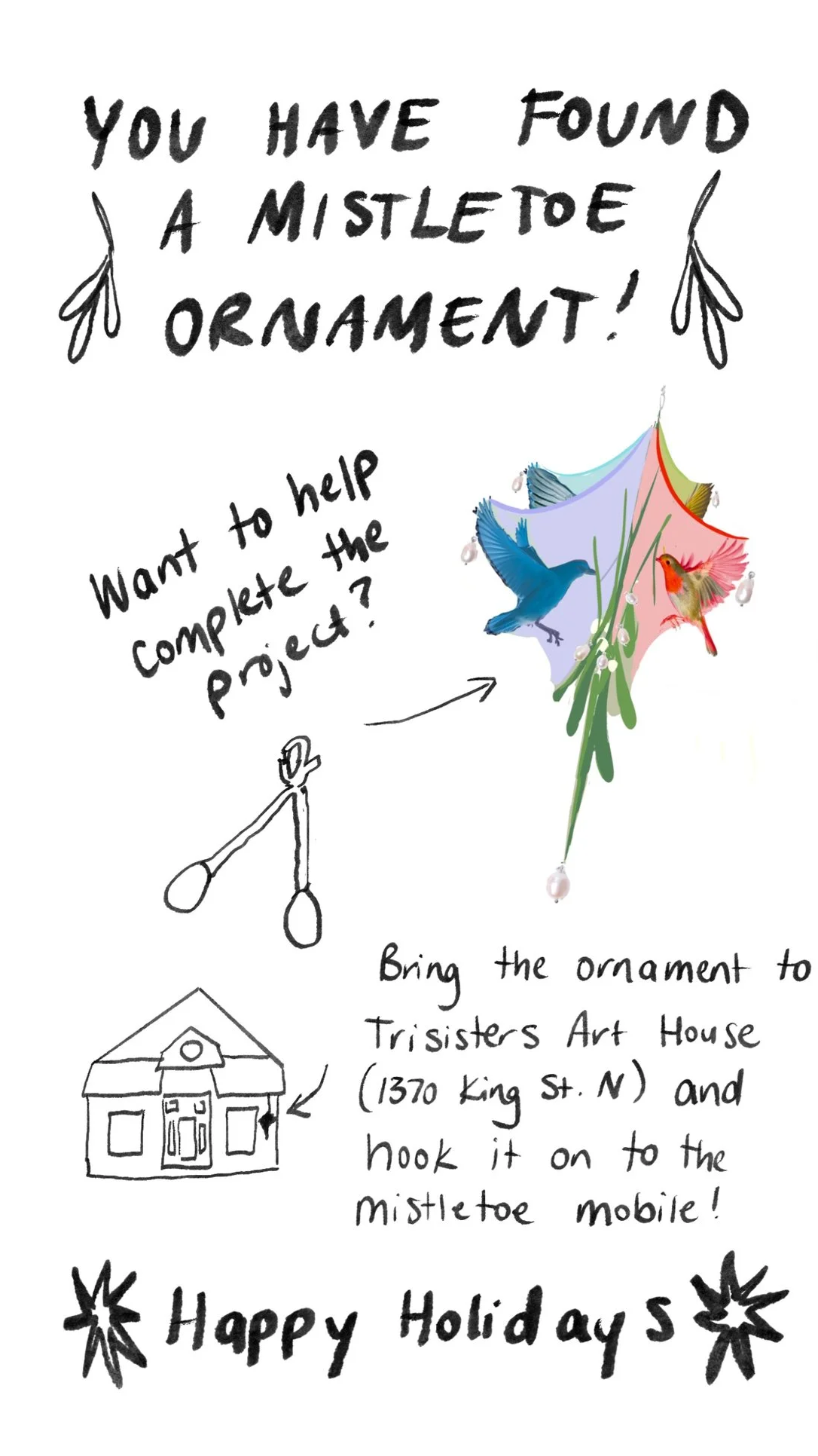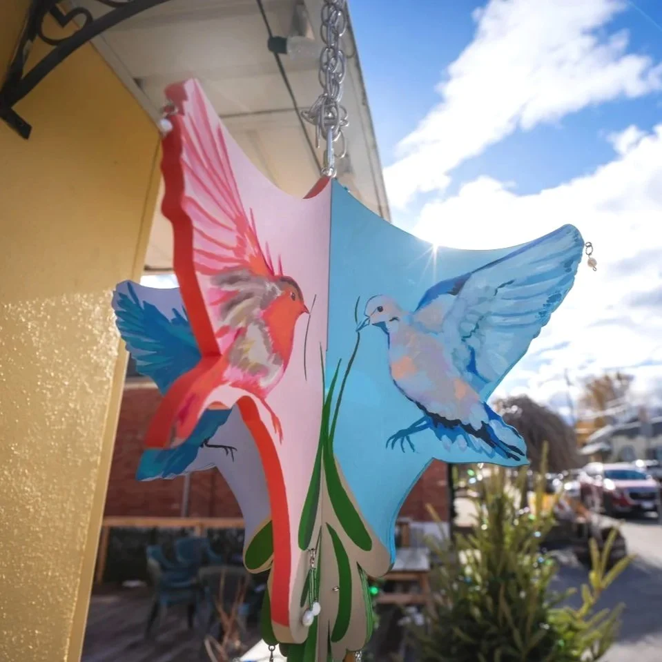Interactive mistletoe for Waterloo Region’s 2025 Mistletoe Trail. Inspired by community, gathering, and the birds who help spread mistletoe. Detachable ornaments made of freshwater pearls and beads were dispersed throughout the community and attached to the sculpture when found by community members. Acrylic, beads, and wire on wood panel.